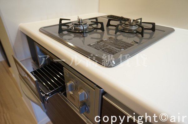 グリル付きの2口ガスコンロ設置済みシステムキッチンは使い勝手の良いシンプル設計。